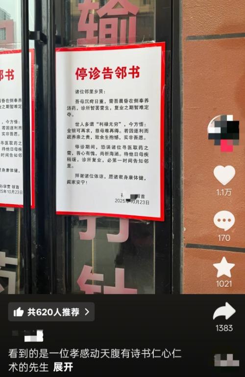 这则《停诊告邻书》在网上流传开后,迅速走红,有人称之为“孝心与文笔俱佳”,其中“世人多谓‘利禄无穷’,今方悟:金银可再求,慈母难再得”“若因逐利而疏养亲之责,致余生抱憾,实非吾愿”等语句更是让人动容,引得不少网民纷纷点赞、转发。