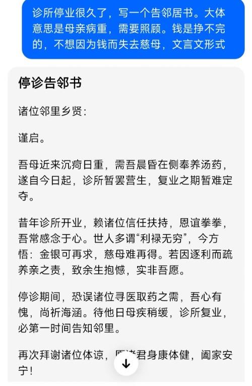 孙先生提供的截图显示,其在某平台上通过打字提出要求:“诊所停业很久了,写一个告邻居书。大体意思是母亲病重,需要照顾。钱是挣不完的,不想因为钱而失去慈母,文言文形式。”随后,AI生成了这则《停诊告邻书》。