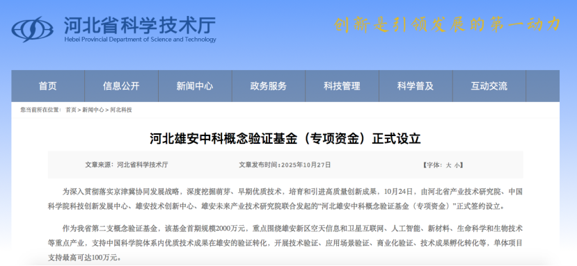 作为河北省第二支概念验证基金,该基金首期规模2000万元,重点围绕雄安新区空天信息和卫星互联网、人工智能、新材料、生命科学和生物技术等重点产业,支持中国科学院体系内优质技术成果在雄安的验证转化,开展技术验证、应用场景验证、商业化验证、技术成果孵化转化等,单体项目支持最高可达100万元。
