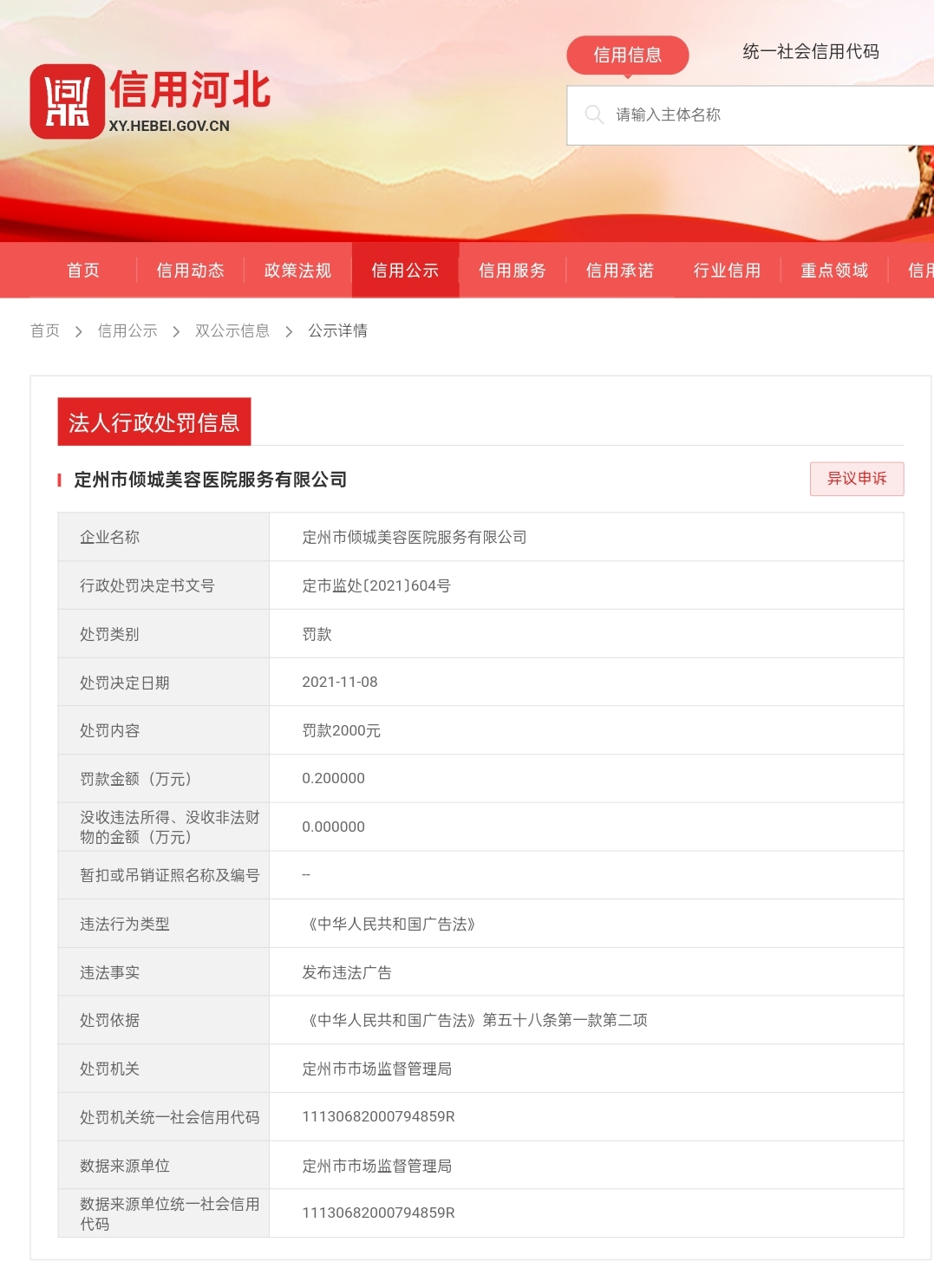 经查询信用河北,2021年11月8日,定州市倾城美容医院因“发布违法广告”,被定州市市场监督管理局罚款2000元。