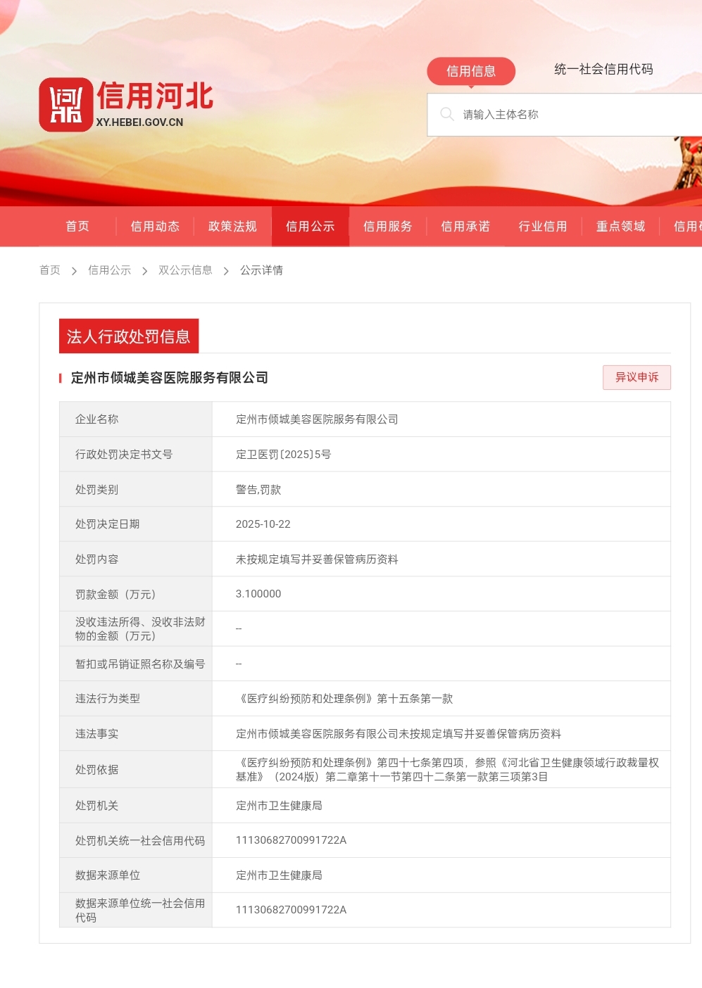 据信用河北官网信息,近日,因“未按规定填写并妥善保管病历资料”,定州市倾城美容医院服务有限公司(以下简称“定州市倾城美容医院”)被定州市卫生健康局处以罚款3.1万元。