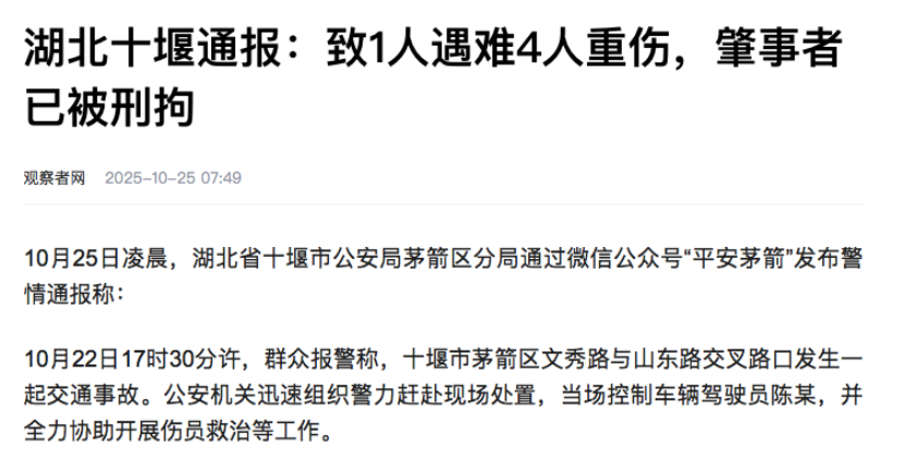 据观察者网消息,10月25日凌晨,湖北省十堰市公安局茅箭区分局通过微信公众号“平安茅箭”发布警情通报称: