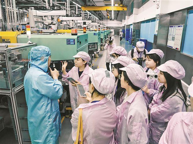 采访团走进厦门宏发电声股份有限公司车间,了解自动化生产情况。