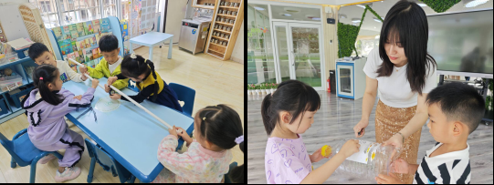 面对植物角的绿植蔫萎耷拉的缺水困境,孩子们拒绝“等帮靠”,主动化身“小小工程师”。他们分组协作,有的和家长一起动手查资料,摸清植物需水规律;有的则围坐研讨,用蜡笔勾勒出“能自己浇水的机器”设计图;还有的收集矿泉水瓶、棉线等材料,搭建出初代浇花器。面对棉线输水太慢、矿泉水瓶漏水、浇水范围不均等接踵而来的问题时,孩子们没有丝毫退缩。他们观察水滴轨迹调整棉线密度,用PVC管制作“动力核心”扩大喷洒范围,甚至尝试接入通信模块实现远程操控。从简易的1.0版本到功能完善的升级款,每一次调整都是“观察—实验—解决”科学思维的实践,也让“敢想敢做”的种子在萌娃们心中扎根。