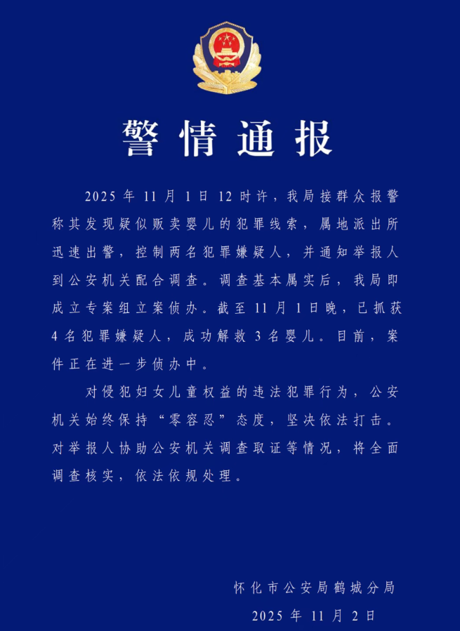 截至11月1日晚,已抓获4名犯罪嫌疑人,成功解救3名婴儿。目前,案件正在进一步侦办中。