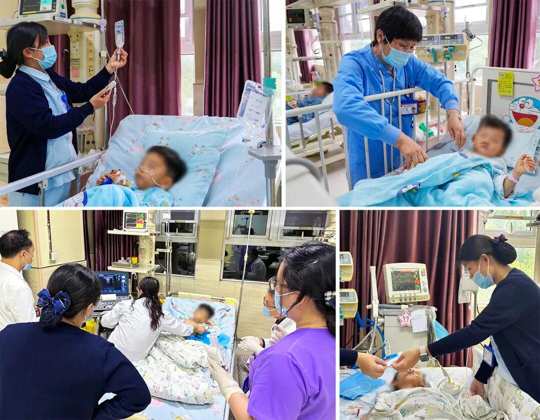 7岁8个月的明明,至今仍是医护人员口中“最惊心动魄的抢救”。入院时,他被确诊为重度糖尿病酮症酸中毒、脓毒性休克、呼吸衰竭、中毒性脑病等9项严重病症,送达PICU时已陷入昏迷,血压低到几乎测不出。“当时孩子的生命体征一直在往下掉,我们连换液体的速度都要精确到分。”参与抢救的护士回忆道。团队立刻启动紧急预案:气管插管、呼吸机辅助通气稳定呼吸,静脉通路快速扩容抗休克,胰岛素精准泵入控制血糖,同时联系药剂科连夜调配特殊药物。整整5个不眠之夜,医护人员轮班守在病床前,监护仪上的每一次数字波动都牵动着所有人的心。当第5天清晨,明明缓缓睁开眼睛,身体各项指标恢复正常值时,守在一旁的护士忍不住红了眼眶——这场与死神的较量,他们赢了。
