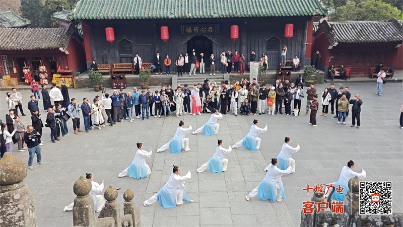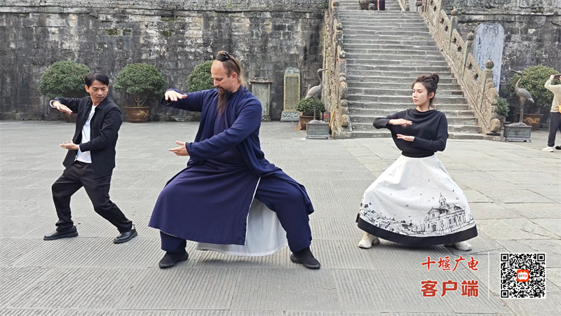 在紫霄宫,武当弟子轮番展示太极拳、武当剑等绝技,刚柔并济的招式搭配空灵的道乐,让主播们赞叹声不断。随后,武当三丰派第十六代传人杰克带领大家习练太极拳与八段锦,这位深耕武当文化的“洋教头”细致拆解动作要领,让主播们亲身感受“以柔克刚”的文化智慧。