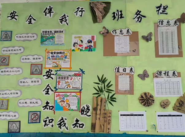 安全教育是学生成长路上的第一道防线。在班级文化墙的显著位置,“安全伴我行”“安全记心中”等主题展板以图文并茂的形式呈现,将交通安全、校园安全、自我保护等知识融入卡通形象与简洁提示中。孩子们在潜移默化中增强安全意识,把“要我安全”转化为“我要安全”的自觉行动。