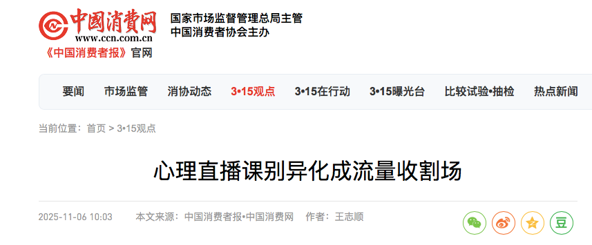 整治这一乱象须在提升公众辨识力与建立完善行业规范方面双重发力。对消费者而言,选择心理服务时要坚守三大原则:一是查资质,即主播应有正规培训经历与督导记录;二要明确区分科普、教育与治疗的不同形式;三要避陷阱,即警惕万能话术与隐私索取。从行业发展角度看,真正的心理科普应聚焦知识传递,而非动辄做些不切实际的承诺;若课程涉及痛苦议题,则须转向专业机构而非依赖直播围观。有关部门应通过分层监管明确直播连麦的边界,禁止以心理咨询为名义公开暴露消费者创伤,同时推动平台切实履责,要求主播公示资质并设置相应举报机制。