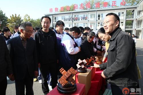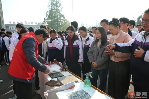 活动现场设五大特色展区,让学生沉浸式感受非遗魅力。鲁班锁展区内,传承人李浩展示多样鲁班锁,讲解榫卯原理与古今应用,学生们动手尝试组装;斗拱展区中,王海军通过实体模型,解析斗拱在古建筑中的结构、力学价值与等级象征,引导学生观察思考;拓印互动区里,刘子宝演示上纸、捶拓、上墨、揭纸全流程,学生们亲手制作拓印作品,体验传统技艺;木雕艺术区中,李晨陈列雅木木雕作品与工序半成品,介绍工艺流程与地域特色,让学生直观感受木雕美学。同时,朝臣庄户剧团的老师们带来柳琴展示与柳琴戏小段演出,悠扬曲调赢得阵阵掌声。