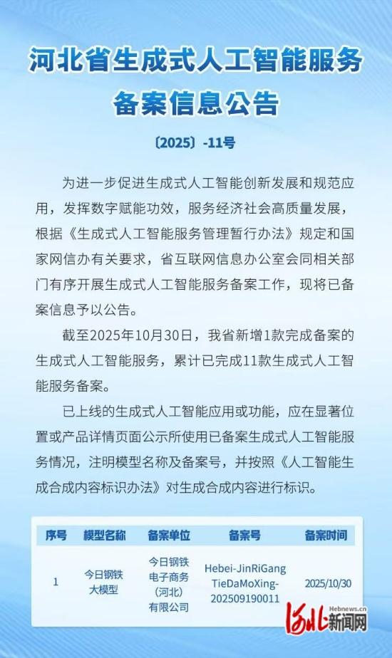 河北新闻网讯(邹雅婕、刘天然、邓小超)近日,由迁安市数工局牵头组织、河北钢谷物联科技股份有限公司主导研发的“今日钢铁大模型”(钢铁行业垂直人工智能模型),顺利通过中央网信办登记备案,正式成为国家认可的合规生成式人工智能(大语言模型)产品。这是2025年唐山市范围内唯一成功备案的大模型项目,标志着迁安市在工业垂直领域人工智能研发与应用方面走在区域前列。