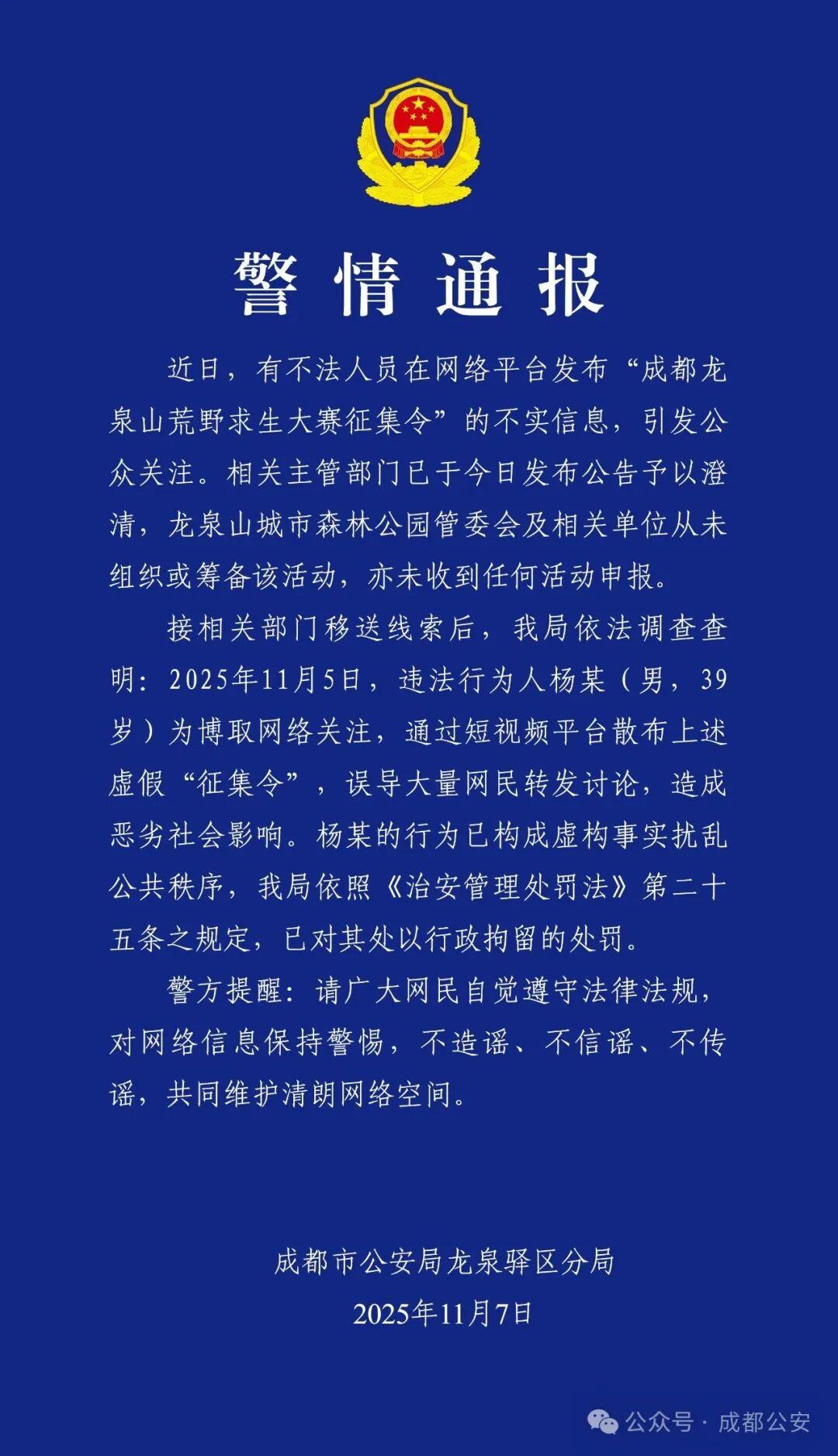 2025年11月7日,成都市公安局龙泉驿区分局发布警情通报: