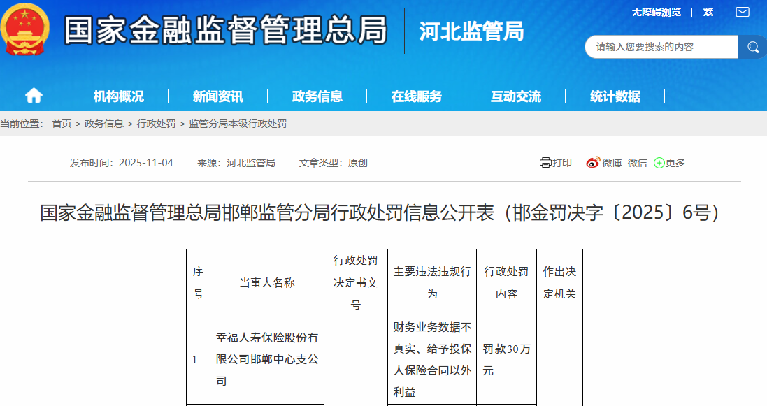 文号“邯金罚决字〔2025〕6号”行政处罚决定书显示,幸福人寿邯郸中心支公司主要违法行为是财务业务数据不真实、给予投保人保险合同以外利益,邯郸监管分局决定对幸福人寿邯郸中心支公司处以罚款30万元的行政处罚。