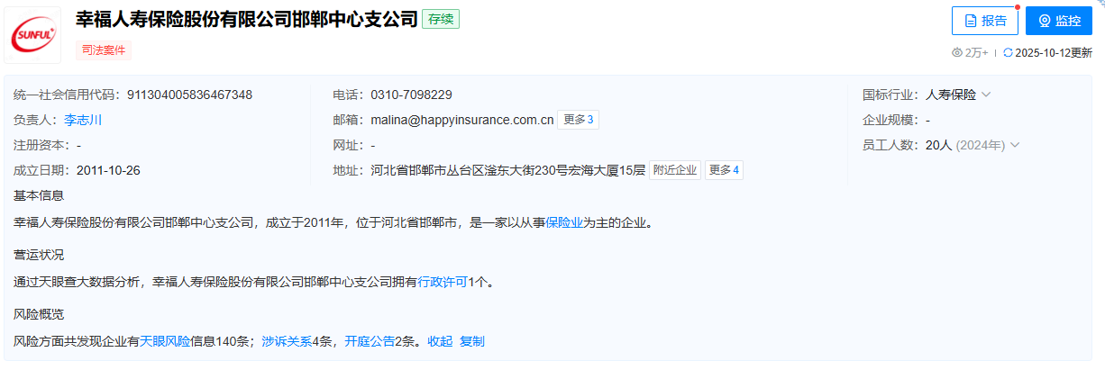 其中,幸福人寿保险股份有限公司邯郸中心支公司经天眼查数据显示,其成立于2011年,位于河北省邯郸市,法定代表人为李志川。