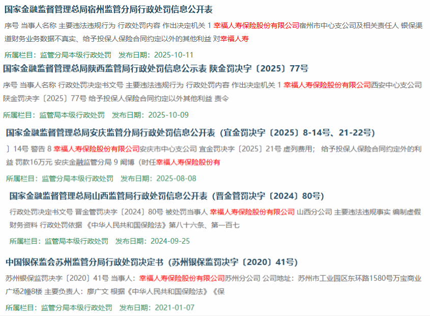 此次并非幸福人寿首次因合规问题被监管处罚。经查询公开信息,幸福人寿分支机构近年来的历史处罚记录多次因类似问题受到监管处罚。
