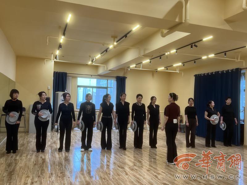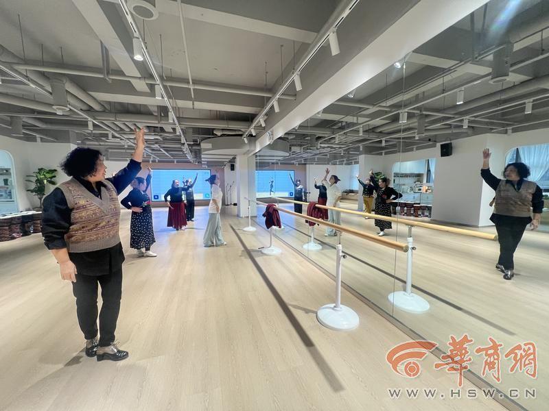 10月17日下午4时许,在西安忆芳华中老年文娱中心的舞蹈室,5名锅庄舞初级班的学员正跟着老师对着镜子练习。