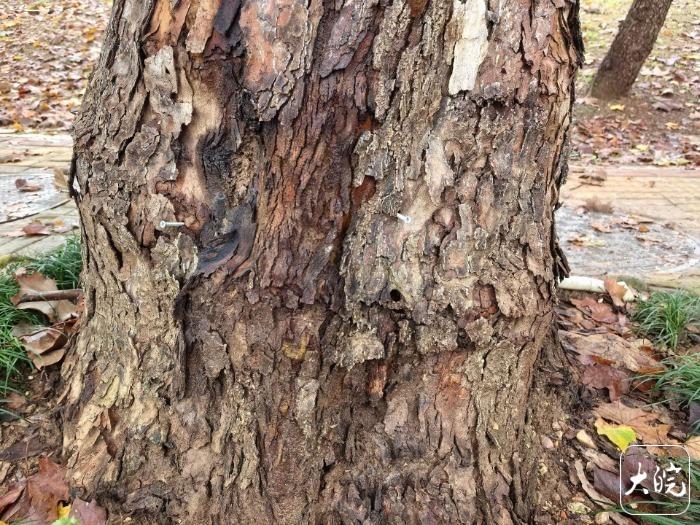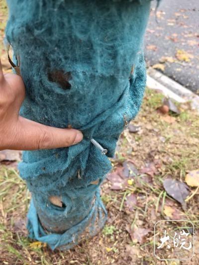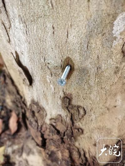 大皖新闻记者随后调查发现,从天河东路与东苑小区路口开始往西南方向,道路两侧行道树都是高大的梧桐树,树根大大小小,但无论大小,树根部距离地面40厘米处都被钉上了钉子,这些钉子不是去年发现的那种小铁钉,而是螺丝钉。这些螺丝钉数量从2根、3根、4根到10根不等,而且间隔一定距离,分布均匀。