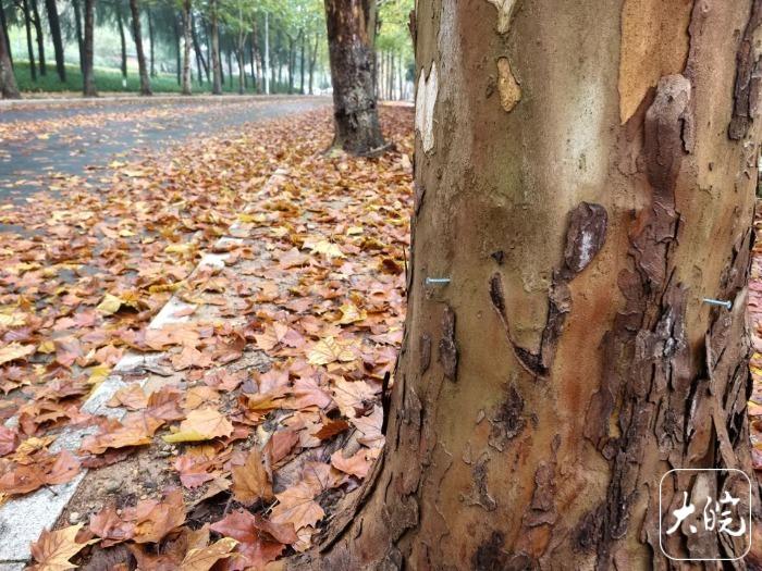 据大皖新闻记者观察,该路口往西南方向道路两侧的行道树都被钉了螺丝钉,只有一棵断头梧桐树幸免。