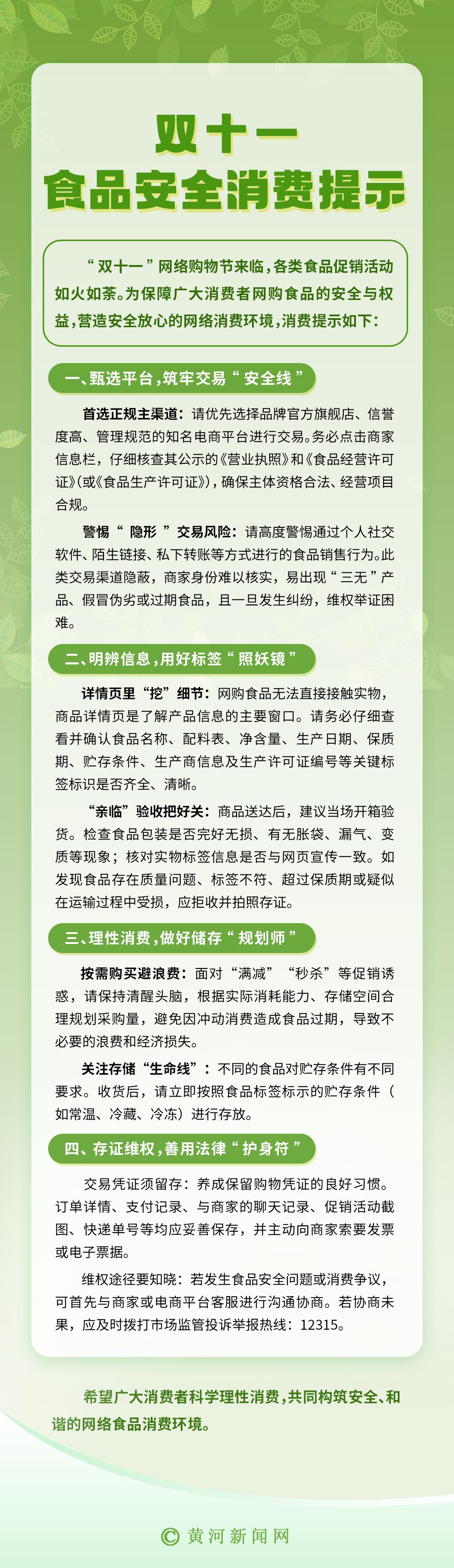 “双十一”网络购物节来临,各类食品促销活动如火如荼。为保障广大消费者网购食品的安全与权益,营造安全放心的网络消费环境,山西省市场监督管理局发布以下消费提示: