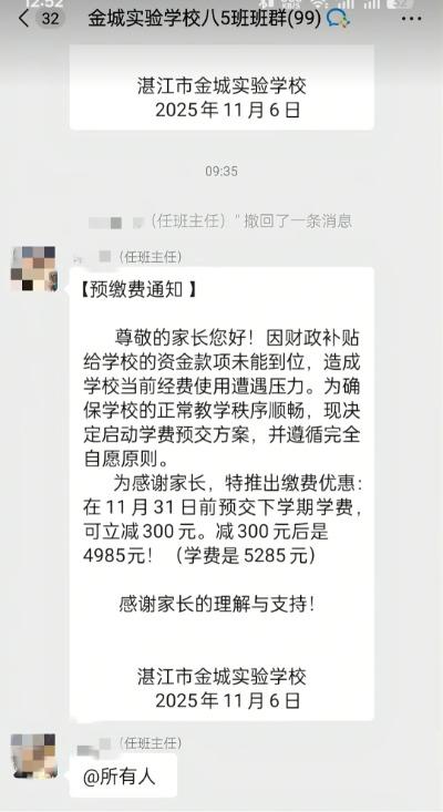 大皖新闻讯 “因财政补贴给学校的资金款项未能到位,造成学校当前经费使用遭遇压力。为确保学校的正常教学秩序顺畅,现决定启动学费预交方案……”11月11日,一则落款为广东湛江市金城实验学校的通知在网上流传开来,引发热议。对此,市教育局回应称,辖区教育局已介入处理。