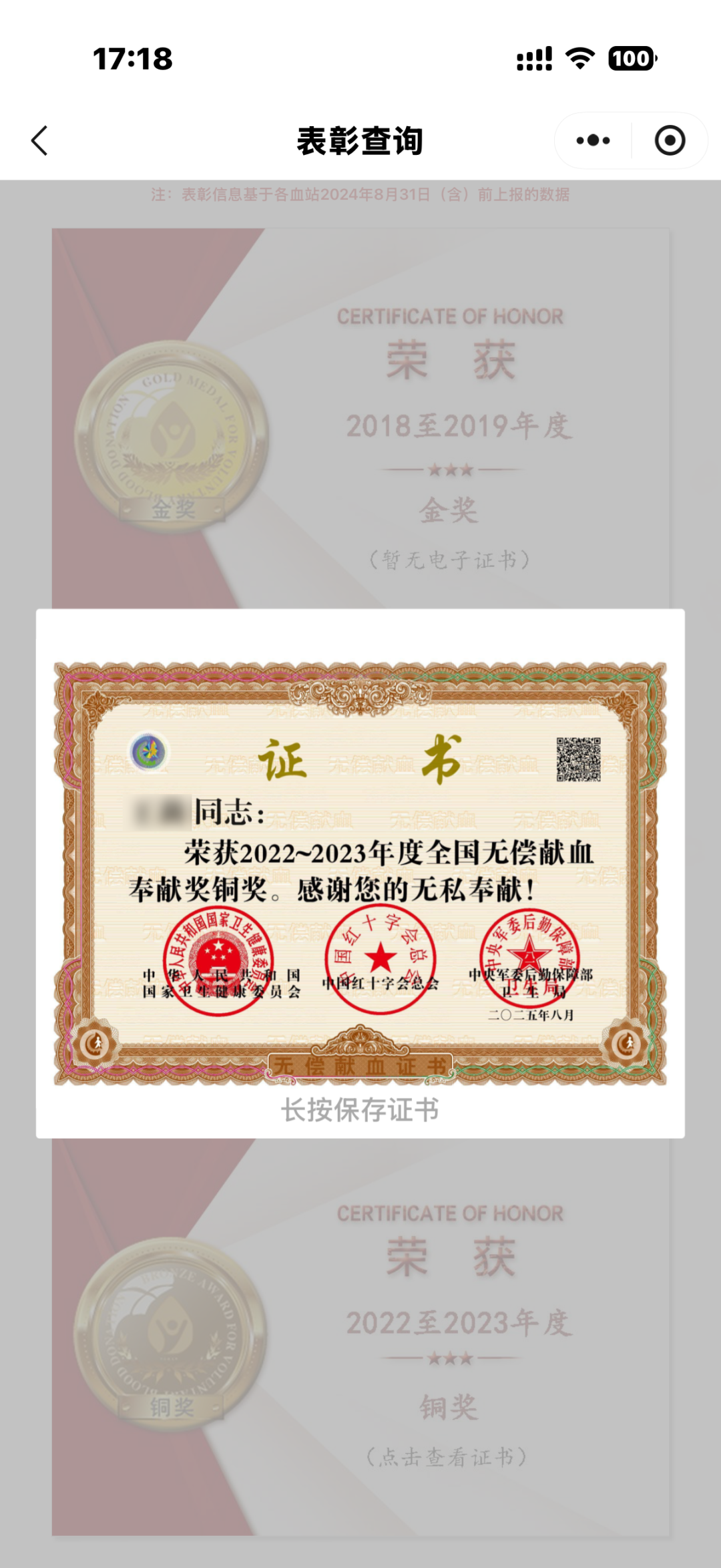 大河网讯 好消息!据河南省红十字血液中心微信公众号,2022—2023年度全国无偿献血奉献奖电子证书已上线,电子证书与纸质证书具有相同效力。快来看看怎么查询领取吧!