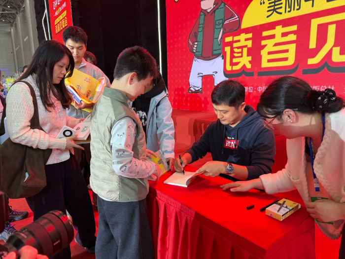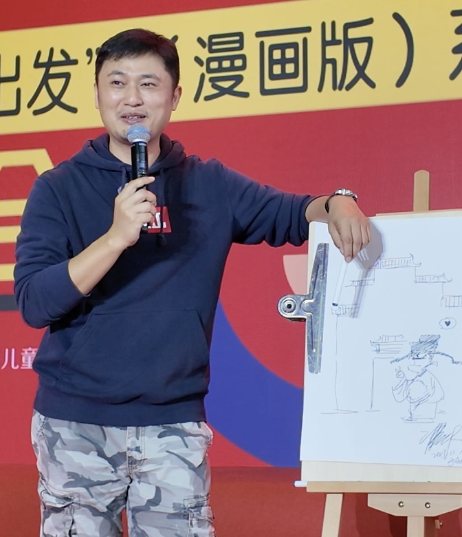 大皖新闻讯 黑白线条勾勒出马头墙,几笔之间,墙下头戴长翅帽、身着圆领官袍、额上弯月牙的包拯形象跃然纸上。这幅仅用两分钟画出的漫画,是“混子哥”陈磊在黄山书会上赠给安徽读者的礼物。11月15日—17日,2025中国黄山书会在合肥滨湖国际会展中心综合馆举行,15日下午,漫画式科普IP“混知”创始人“混子哥”陈磊在“边画边讲——跟着混知哥纸上游中国‘美丽中国·从家乡出发(漫画版)’读者见面会”上亮相。