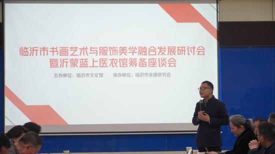 临沂市非遗研究会会长郑英就项目背景作了详细说明,阐述了“沂蒙蓝上医衣馆”的筹备思路与发展愿景,强调以书画艺术赋能服饰设计,打造具有临沂特色的文化品牌。