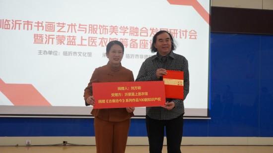 著名艺术家刘方明向沂蒙蓝上医衣馆捐赠《古像洽今》系列作品100幅知识产权。刘方明作为江苏省华侨书画院副院长、扬州八怪研究会会长,其作品兼具传统底蕴与现代气息,此次捐赠为书画艺术与服饰设计的融合提供了宝贵的创作资源。