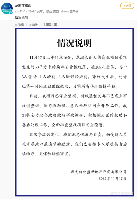 11月17日下午,西安龙湖地产发展有限公司官方账号发布情况说明并致歉:11月17日上午11点16分,龙湖长乐天街商业项目吊顶发生约30平方米的局部石膏板脱落,造成8人受伤,其中3人骨折,4人轻伤,1人脚部轻微伤。事故发生后,伤者已第一时间送往医院救治,目前所有伤者伤情平稳。目前,项目已停业整顿,新城区相关部门已成立事故调查组、医疗救助组、善后处理组同步开展工作↓↓