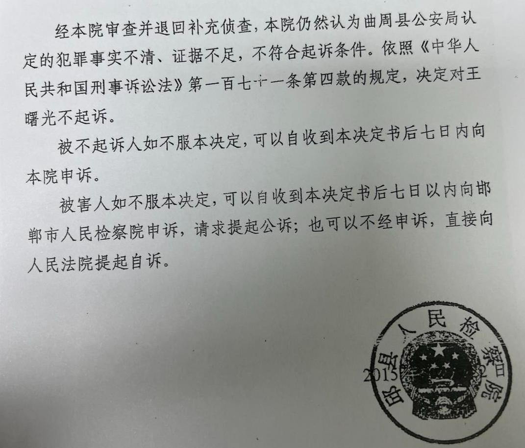 2015年,案件被指定由邱县人民法院管辖。2015年12月,邱县人民检察院作出了不起诉决定,称“经本院审查并退回补充侦查、本院仍然认为曲周县公安局认定的犯罪事实不清、证据不足,不符合起诉条件。”