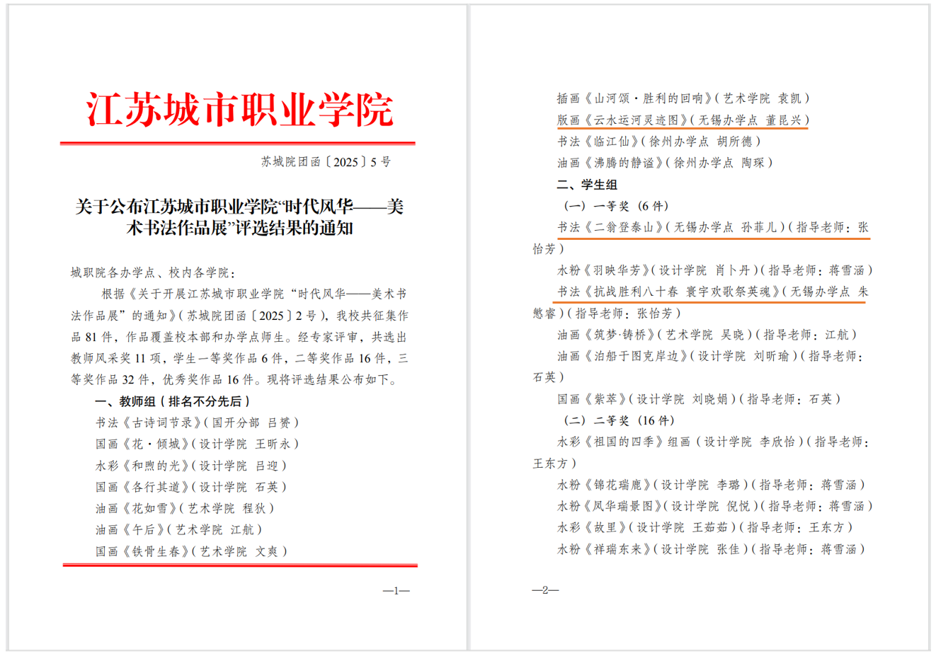 近日,从江苏城市职业学院传来捷报,在“时代风华——美术书法作品展”评选结果正式公布的通知中,无锡开放大学师生凭借扎实的专业功底、丰富的创作灵感与深刻的主题表达,一举斩获11项荣誉,充分展现了学校在艺术教育领域的丰硕成果与师生们昂扬向上的时代风采。