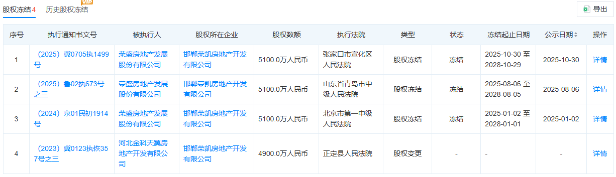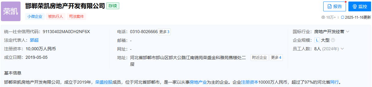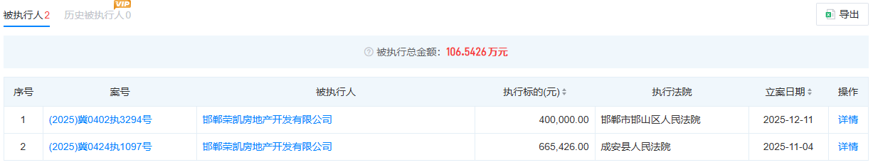 此外,邯郸荣凯房地产开发有限公司今年2025年11月4日被邯郸市邯山区人民法院立案被执行665,426万元,案号为(2025)冀0402执3294号。