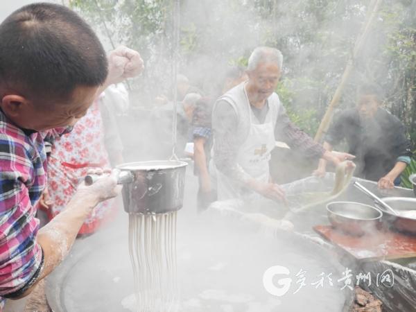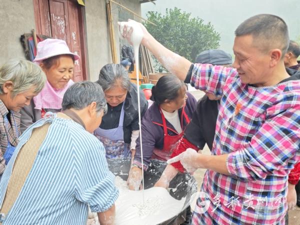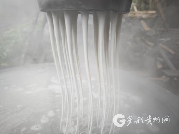 此刻,村民把和好的粉芡团放入带孔的漏瓢,许廷华动手拍打,条条银丝便均匀落入滚水,瞬间定型。王世伦眼疾手快,转到捞粉,便将熟粉在流动冷水桶里冷却;灶膛边,主人家刘邦强专注地添着柴,守护着那一锅沸腾不息。