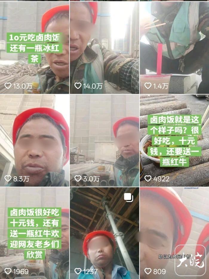大皖新闻记者注意到,11月17日,张腾飞在个人账号发布了第一条视频,称自己准备摆摊,请大家提提建议,在评论区,不少网民建议他到工地门口卖盒饭。两天后,他更新了一条在工地门口摆摊卖卤肉饭的视频。此后,更新趋于常态化。视频中,来就餐的多为工人,饭菜分量大,价格多为10元。