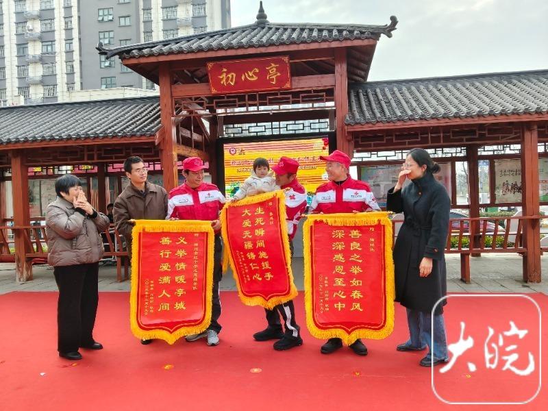 赠给张延骏的锦旗上写着“生死瞬间施援手,大爱无疆铸仁心”,赠给陶延生的锦旗上写着“善良之举如春风,深深感恩至心中”,赠予服务队的锦旗上写着“义举情暖亭城,善行爱满人间”。