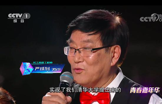 舞台上,一众银发男声部中,严成钊顶着一头浓密黑发。