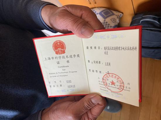 王显周荣获上海科技进步奖一等奖。 澎湃新闻记者 朱奕奕 图