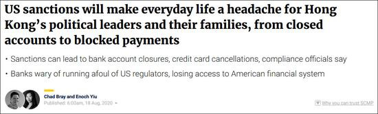 《南华早报》报道:美国制裁影响香港官员及家人日常生活