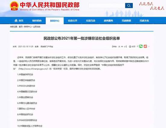 2月18日,民政部官网公布了2021年第一批涉嫌非法社会组织名单,中国美学研究会、中国区块链委员会、中非文化友谊协会、中国爱国文艺家协会、中国志愿者协会、中国文化建设委员会、国际华人艺术协会、中国党史研究会、中华余氏宗亲联合会、中国复合型人才培养协会等十个组织被列入名单。