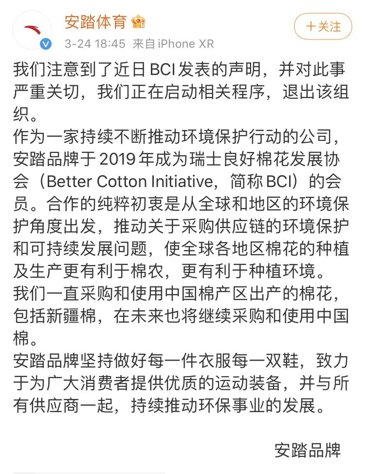 3月24日,安踏官方微博@安踏体育发表声明称,注意到了近日BCI发表的声明,并对此事严重关切,我们正在启动相关程序,退出该组织。声明还称,安踏一直采购和使用中国棉产区出产的棉花,包括新疆棉,在未来也将继续采购和使用中国棉。