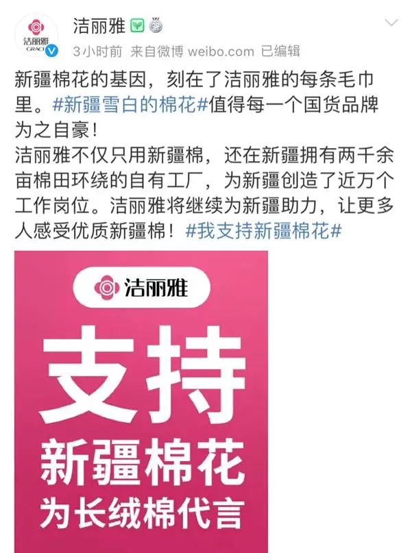3月25日,洁丽雅官方微博@洁丽雅发表声明称,“洁丽雅不仅只用新疆棉,还在新疆拥有两千余亩棉田环绕的自有工厂,为新疆创造了近千万个工作岗位。洁丽雅将继续为新疆助力,让更多人感受优质新疆棉!。”