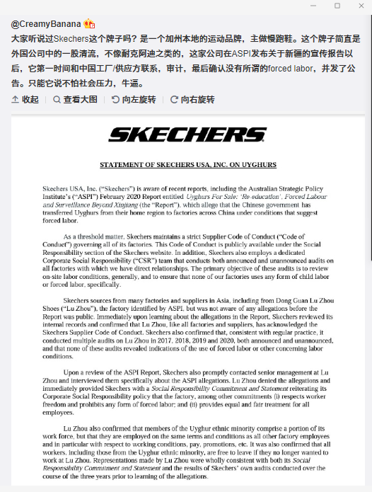 近日,Skechers在官网发布了一则声明被网友找到,在ASPI污蔑新疆“强迫劳动”报告发布后,它第一时间和供应方取得联系,了解真实情况。