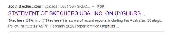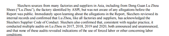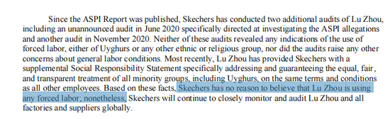 Skechers从亚洲的许多工厂和供应商那里获得消息,包括ASPI认定的位于东莞的绿洲鞋厂(以下简称绿洲),在得知报告中的指控后,Skechers立刻检查了其内部记录, Skechers还确认,按照常规做法,Skechers在2017年,2018年,2019年和2020年对绿洲进行了多次审查,包括已宣布和未宣布的审查,并且这些审查均未显示出使用强迫劳动或其他有关劳动条件的迹象。