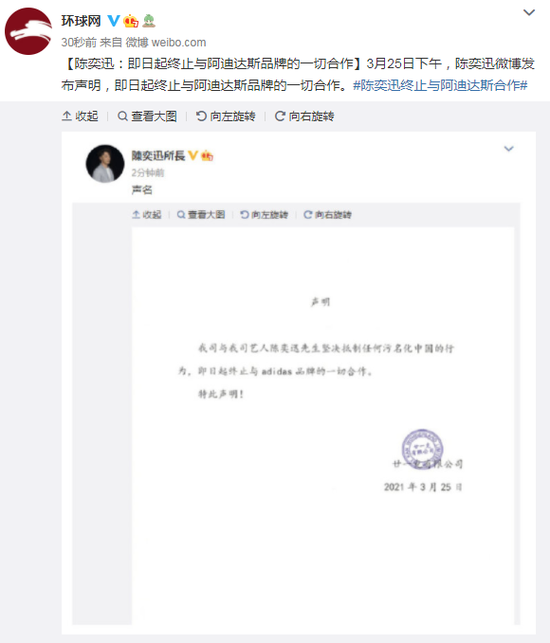 原标题:陈奕迅:即日起终止与阿迪达斯品牌的一切合作