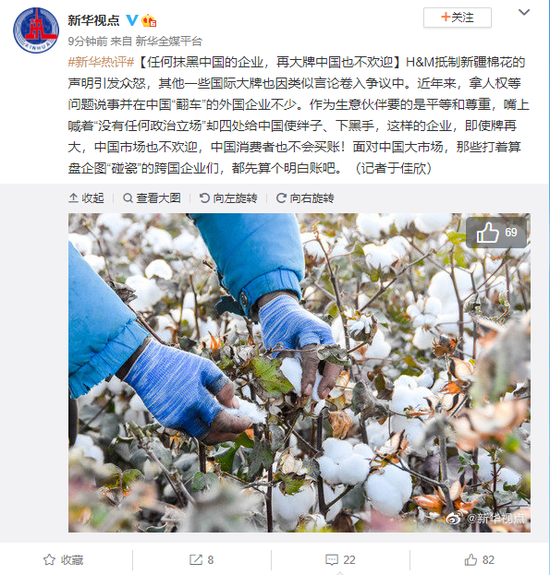 H&M抵制新疆棉花的声明引发众怒,其他一些国际大牌也因类似言论卷入争议中。近年来,拿人权等问题说事并在中国“翻车”的外国企业不少。作为生意伙伴要的是平等和尊重,嘴上喊着“没有任何政治立场”却四处给中国使绊子、下黑手,这样的企业,即使牌再大,中国市场也不欢迎,中国消费者也不会买账!面对中国大市场,那些打着算盘企图“碰瓷”的跨国企业们,都先算个明白账吧。(记者于佳欣)