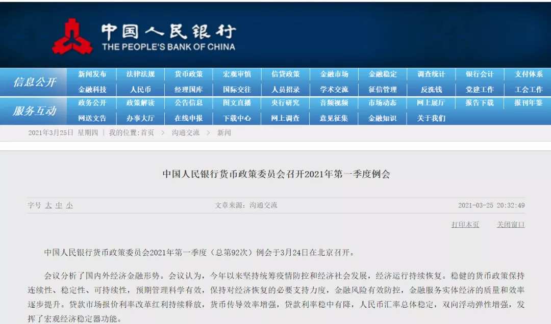 就在全球央行蠢蠢欲动的时候,早有准备的中国央行表现淡定。中国人民银行货币政策委员会2021年第一季度(总第92次)例会于3月24日在北京召开。