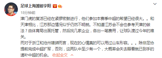 姬宇阳在个人微博上写道:“津门虎的复活已经在紧锣密鼓进行,他们参加本赛季中超的希望已经很大。和天津相比,江苏那边情况似乎仍然不明朗。不知道江苏会不会也参考天津的做法?由体育局出面托管,然后找几家企业,各出一笔费用,让球队渡过今年的难关。”
