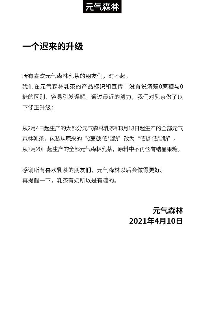 4月11日消息,4月10日晚间,元气森林在其官方微博发布公告称,其在元气森林乳茶的产品标识和宣传中没有说清楚0蔗糖与0糖的区别,容易引发误解。元气森林表示,对乳茶做了以下修正升级,从2月4日起生产的大部分元气森林乳茶和3月18日起生产的全部元气森林乳茶,包装从原来的“0蔗糖低脂肪”改为“低糖低脂肪”。从3月20日起生产的全部元气森林乳茶,原料中不再含有结晶果糖。