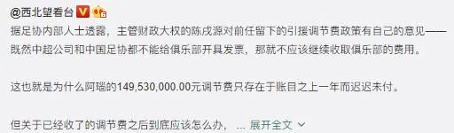 @西北望看台: 据足协内部人士透露,主管财政大权的陈戌源对前任留下的引援调节费政策有自己的意见——既然中超公司和中国足协都不能给俱乐部开具发票,那就不应该继续收取俱乐部的费用。 这也就是为什么阿瑙的149,530,000.00元调节费只存在于账目之上一年而迟迟未付。 但关于已经收了的调节费之后到底应该怎么办,