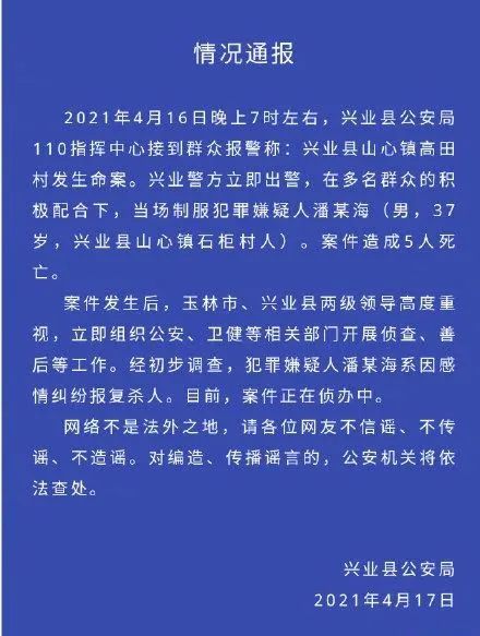 据广西兴业县公安局官方通报,2021年4月16日晚上7时左右,兴业县公安局110指挥中心接到群众报警称:兴业县山心镇高田村发生命案。兴业警方立即出警,在多名群众的积极配合下,当场制服犯罪嫌疑人潘某海(男,37岁,兴业县山心镇石柜村人)。案件造成5人死亡。